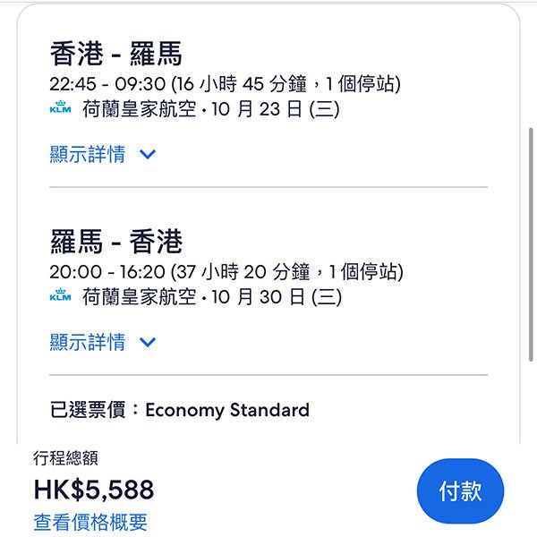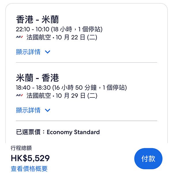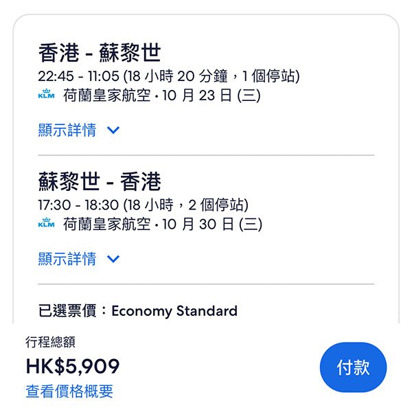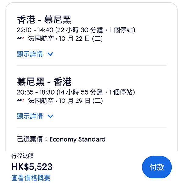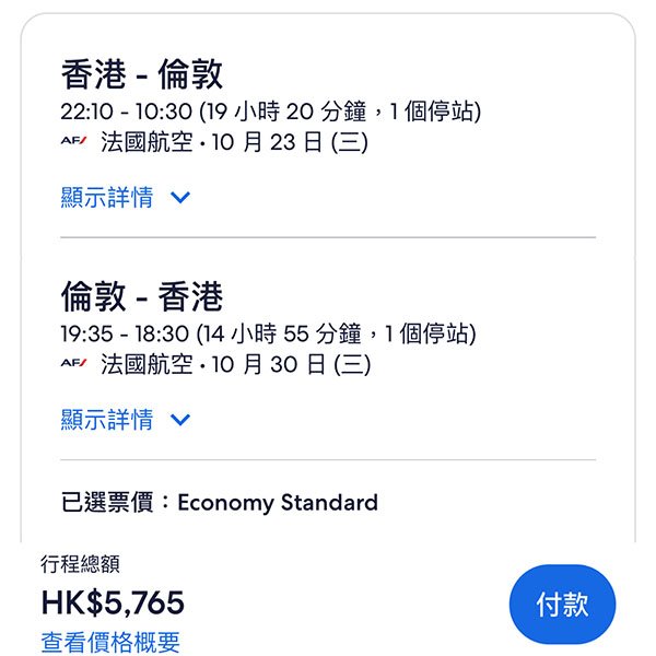 結論:經法國/荷蘭轉機,航點夠多,熱門嘅倫敦同曼徹斯特都有,探親啱晒!背包客仲抵,淨包12kg手提行李,5千蚊都唔洗。Check過系統,10、11月供應比較充足。