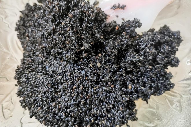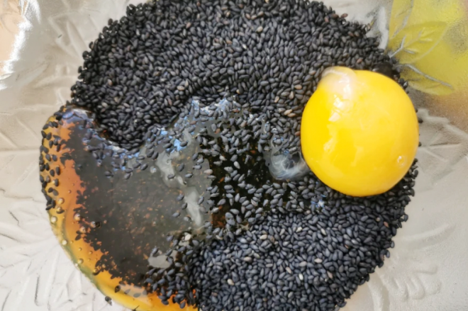 1、黑芝麻200克、雞蛋1個、蜂蜜30克,將所有食材放入碗中,混合均勻;