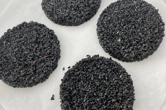 2、在烤盤上鋪烘焙紙,然後舀一勺黑芝麻,用模具按壓成型;