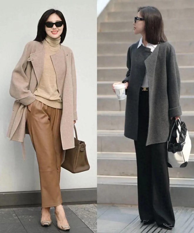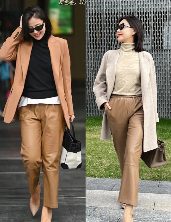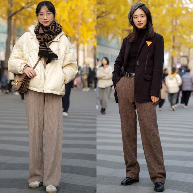冬天最需要去嘗試的就是氛圍感十足的穿搭,比如今年冬天很火的美拉德棕,就可以放心的用於褲裝當中,無論是淺棕色、深棕色還是棕褐色,都能很好的提升造型的質感。而且,深色褲裝無論是寬鬆的版型還是修身的版型,在視覺上都是很顯瘦的。