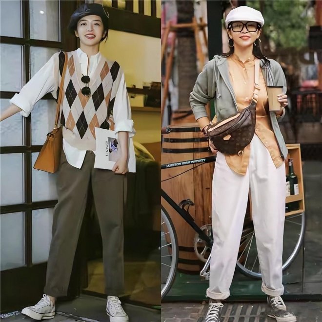 不同的褲裝版型,意味著我們要定義不同的風格走向,像這種九分長度的錐形褲,就很適合走復古風的路線。軍綠色的九分錐形褲,配基礎款襯衫和格棱馬甲文藝范兒滿滿;白色九分錐形褲,就可以搭配彩色系的修身上衣。
