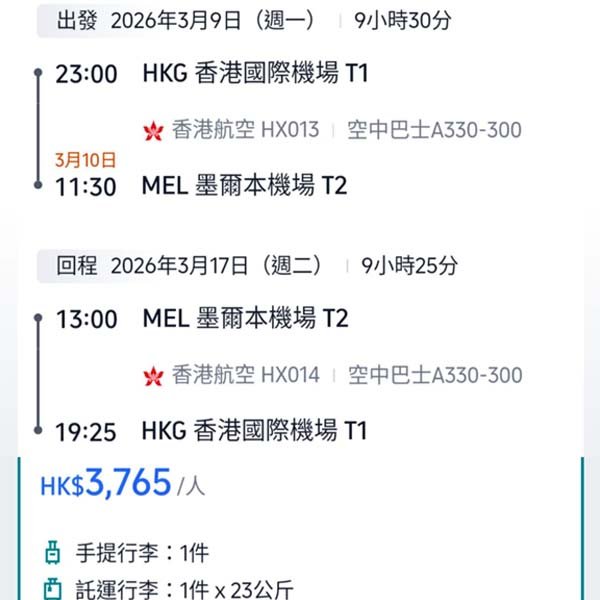 【墨爾本】激抵直航!四千有找!香港航空來回墨爾本連稅$3,765起!2026年2月尾至3月尾出發