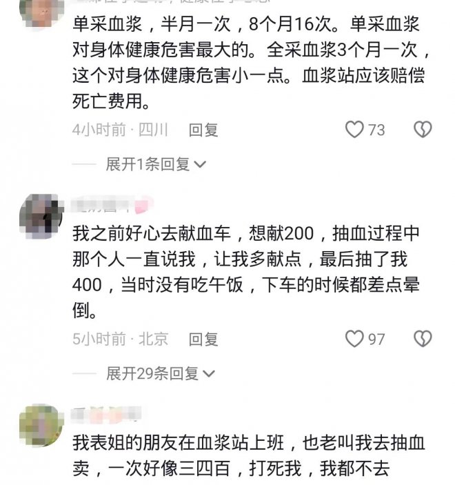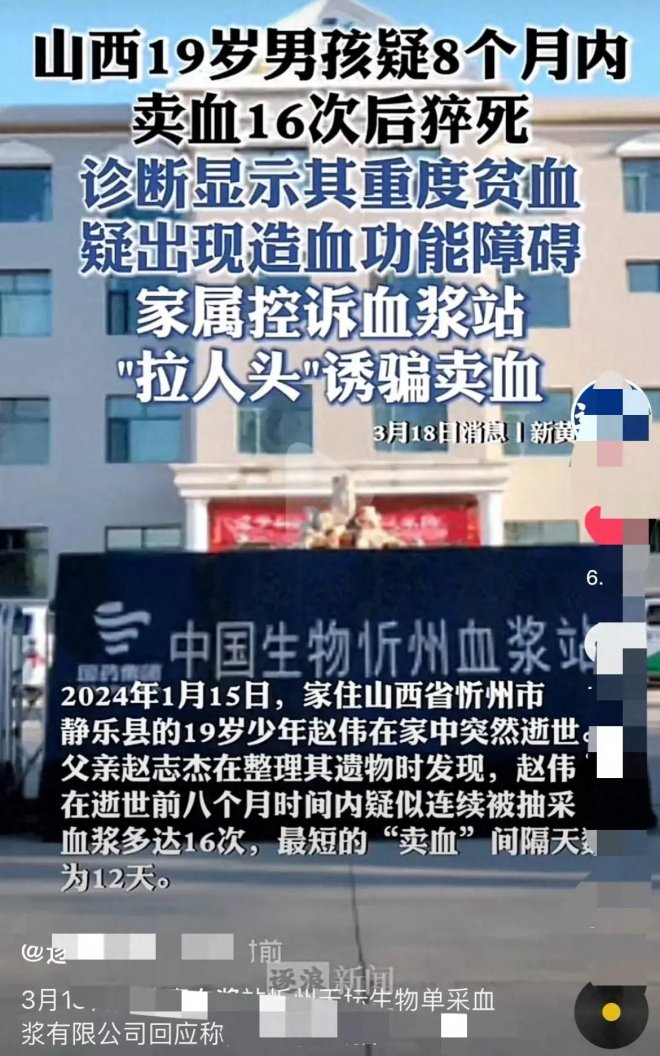 查看兒子手機後,趙父才知道兒子竟到血漿站賣血,在去年5月認識一名男子,在那之後接觸到「忻州血漿站」,該名男子甚至提供接送服務,每月2次將兒子載去捐血,每捐一次就能收到260元至300元人民幣(約新台幣1145元到1320元)左右的費用,令他感到訝異的是,兒子在猝死10天前也懷疑身體出狀況,自行到醫院檢查,檢查單上顯示他有嚴重貧血,甚至出現造血功能障礙。