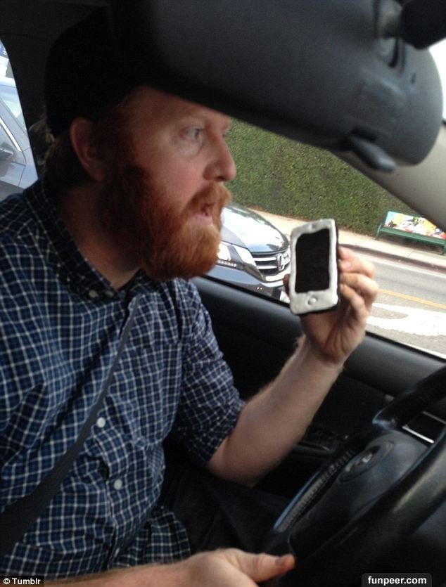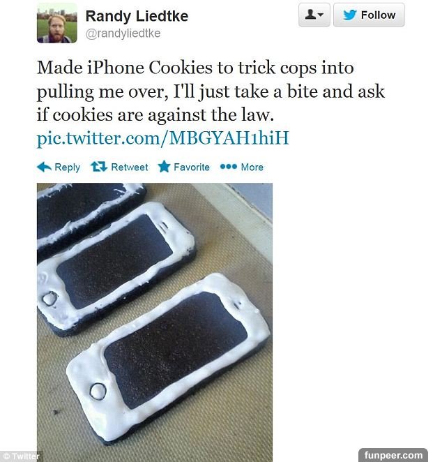 美國很多州都有規定,開車時不能使用手機。這當然是為了民眾的安全著想,不過洛杉磯喜劇演員Randy Liedtke卻利用這一點設計了一個有趣的惡作劇。▼他專門烤了一些看起來很像iPhone的餅乾,然後邊開車邊拿著餅乾講話,看起來就像在聊電話。