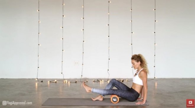 近期流行的「假胯寬」也可藉由瑜珈柱來改善,放在其中一隻大腿側邊,另隻腳向前跨並採在地板幫助撐住身體,一樣前後滾動瑜珈柱做按摩,放鬆大腿肌肉
