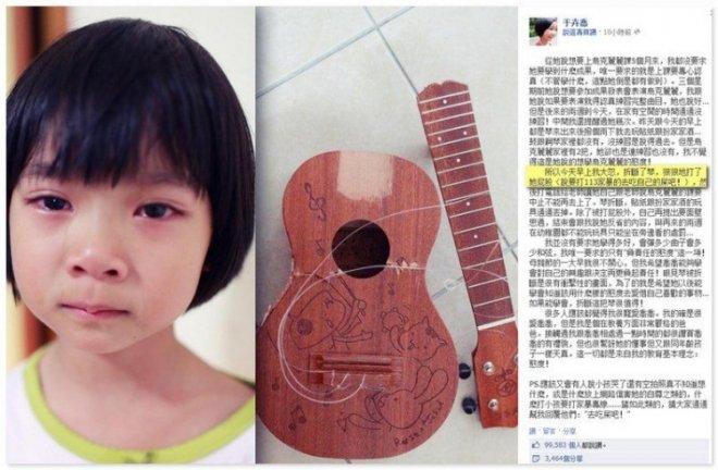 情緒失控打小孩、當場率爛烏克麗麗給喬喬看,接著在臉書拍下女兒大哭模樣、爛掉的琴