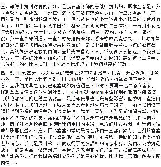 我是今天早上接到記者詢問電話才得知喬媽不幸病逝的消息,喬媽的親友們不知道是有意還是無意的對我們隱瞞噩耗,爾後發消息給媒體並擷取我們當日的生活作息攻訐發布新聞,對我個人造成的影響我並不在意,因為喬喬和喬媽最清楚我們一直都在努力,但對於喬喬跟喬媽我非常的心疼。我很驚訝為何喬媽的親人不肯第一時間通知我們喬媽過世的消息,反倒是周刊第一時間取得了更多詳細的消息來源,我們以為喬媽最放不下的是喬喬,沒想到這件事情卻是媒體首先得知公布,我實在無法理解。我告訴喬喬要相信我與喬媽對於喬喬都是真心的愛,所以我也不願再多去揣摩內情了。