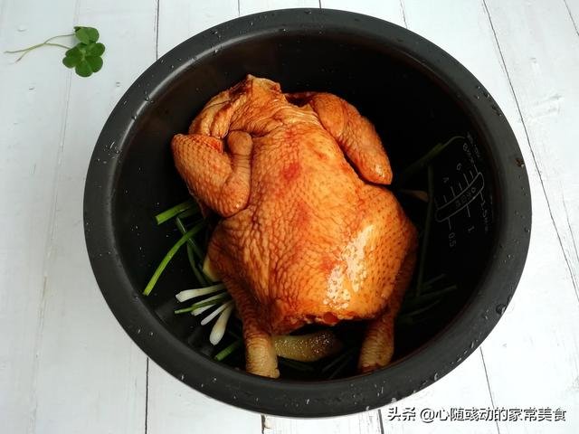 第六步:把剩下的香蔥和薑片鋪在電鍋底部,再擺入腌制好的雞肉,淋入剩餘的料汁,蓋上鍋蓋,選擇煮飯鍵,保溫后即可出鍋享用。現在的智能電鍋,一般有兩個煮飯鍵,一個是香彈煮40分鐘,一個是加快煮20分鐘。