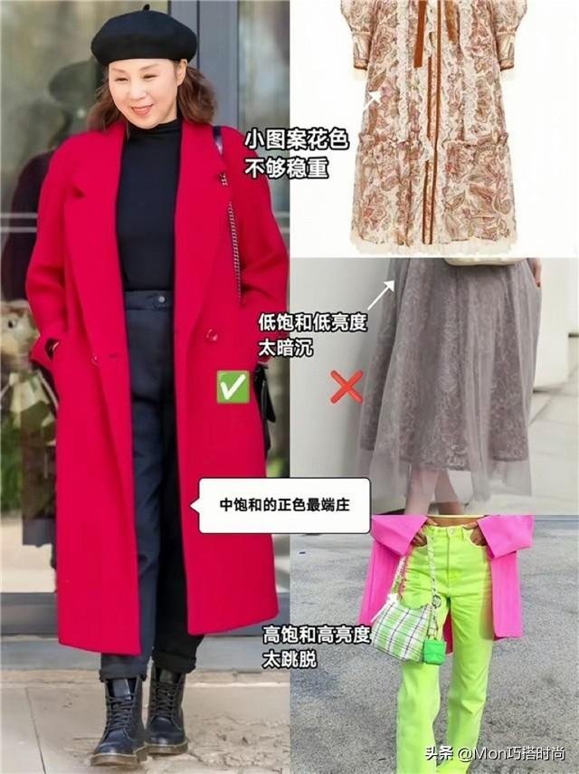 在選擇衣服的顏色時,中年女人其實經常會走入一些雷區。選擇不合適的顏色就容易讓氣質變差,首先你得規避那種暗沉老氣的顏色,比如說像這種色調太深的黑色或者是深棕色。雖然是一種很基礎的色彩,但是像這種暗沉的色彩沒有亮度,搭配在身上,對皮膚提亮的效果很差,都特別容易顯老。