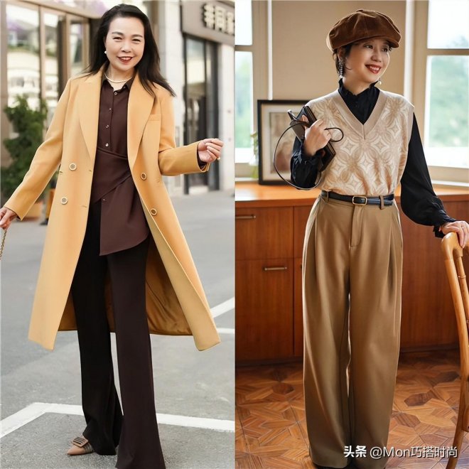 所以在一般情況下,中年女人如果要選衣服,基本上都還是喜歡嘗試相近色或者是同色搭配,就像大地色所包含的色彩也很多,當我們選擇耐看的大地色單品組合起來,高級感撲面而來,完全不會覺得廉價。