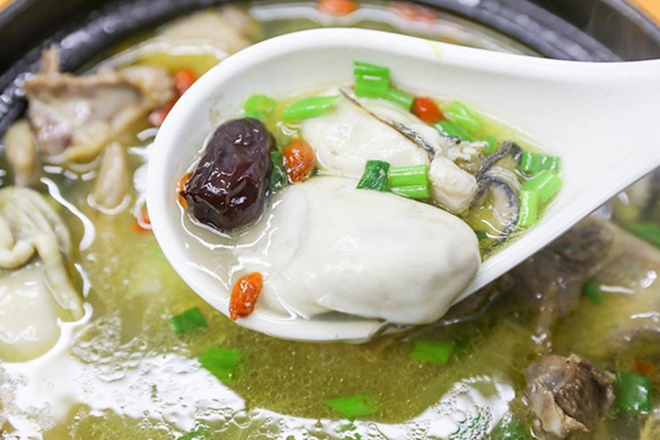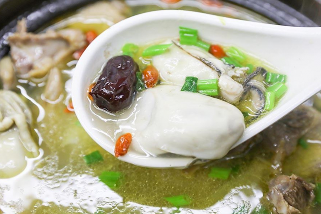 4.一個小時以後挑出裡面的蔥姜,加入味精、雞粉、胡椒、白糖調味,再放入生蚝和枸杞,蓋上蓋子繼續燉煮2分鐘,香味融合后美味即成。