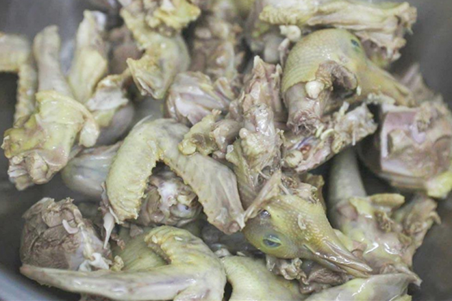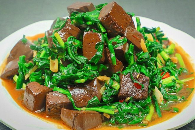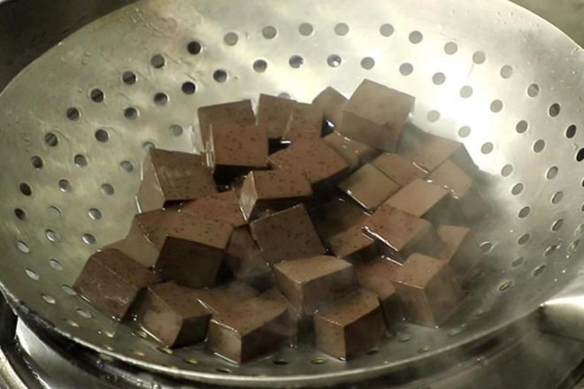 2.鍋內燒水,加入一勺食鹽入底味,少許料酒去腥,倒入鴨血慢慢煮出裡面的血水和雜質,水燒開后打去浮沫,然後把鴨血倒出來沖洗乾淨。
