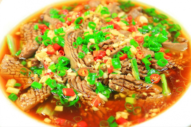 5.鍋內燒水,水燒開以後轉小火,放入腰花滑煮30秒鐘,腰花變色打卷以後倒出來放入盤中,倒入調好的料汁,撒上蔥花,澆上200度的熱油激發出香味,美味即成。