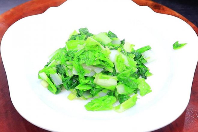 4.熱鍋涼油,放入蔥花爆香,放入小白菜段大火翻炒一分鐘,白菜斷生以後加入食鹽調味,繼續翻勻后盛放在盤中墊底。