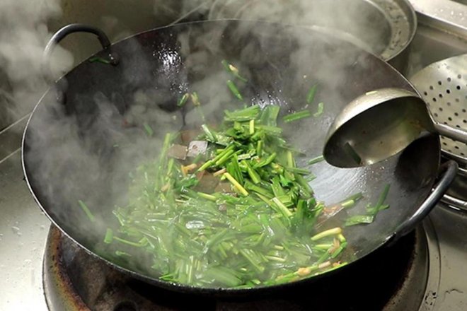 4.3分鐘以後倒入韭菜段,大火快速翻勻,韭菜返青以後勾入少許水澱粉、讓調料更好地吸附在食材表面,淋入明油提亮色澤,翻勻后美味即成。