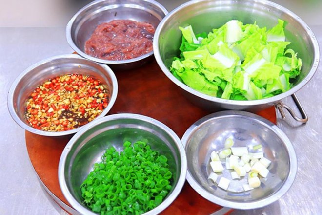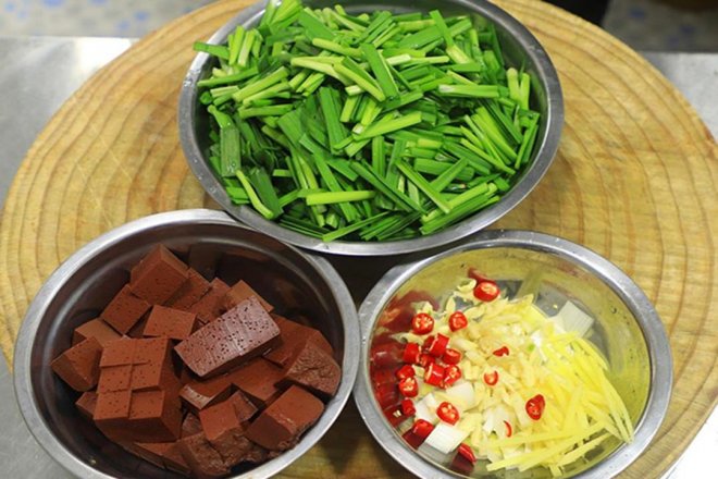 1.韭菜擇洗乾淨,切成小段;鴨血沖洗乾淨,切成2厘米左右的方丁;再切點蔥花、薑絲、蒜末、小米椒圈,一起放在碗中。