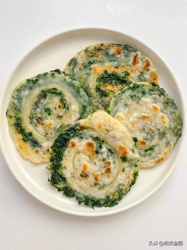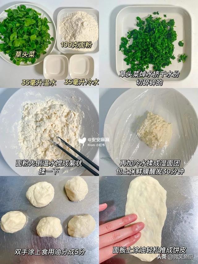 我們需要先備料:草頭菜、35毫升的溫水和冷水、100克的麵粉。首先,將草頭菜擠乾水分、切至碎末狀備用。另一邊,將麵粉倒溫水攪拌揉勻,再加冷水揉成溼麵糰,蓋上保鮮膜醒發半小時。雙手塗食用油,將麵團分成五等分,每個麵團推成餅皮狀,再放上切碎的草頭菜,捲成長條、圈起來壓扁,小火煎至金黃就可以囉!至於吃不完的餅,可放冷凍保存一個月沒問題!