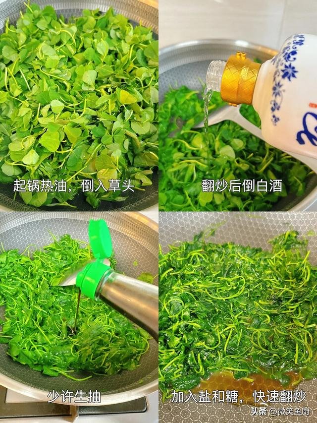我們先起鍋熱油,倒入草頭,接著翻炒後倒白酒、少許生抽(純釀醬油),並加入鹽巴和糖快速翻炒。