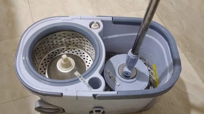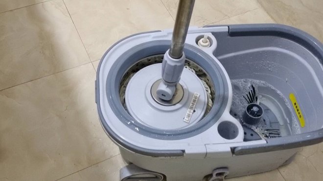 接著我們把拖把稍微攪乾一下,甩掉上面一些多餘的水分,然後我們就可以給衛生間拖地了。