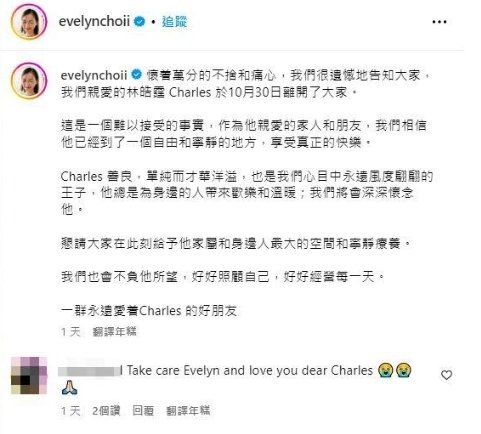 香港男星林皓霆(Charles)作為男模特兒出道,在時尚界享有極高評價,加上他本就出眾的帥氣外貌,更是深得許多女性粉絲的喜愛,然而先前卻傳出,他已經過世的消息,陳屍在賓館房間內享年35歲,並在現場找到遺書,妹妹也沉痛發聲了。