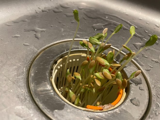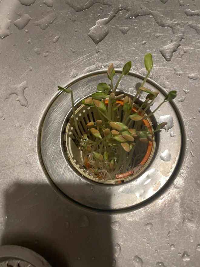 只見流理台排水口中竟生機篷勃,冒出大量類似豆芽的植物,看起來就像他在那裡種菜一般,驚嚇之餘他才仔細回想外出前做了什麼,尷尬表示:「我在出門前吃了哈密瓜......」當時吃完後就將籽倒在排水口,沒來得及清理廚餘就出門了,沒想到種子竟然靠著剩餘的水漬瘋狂生長!
