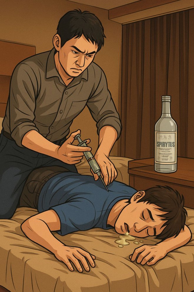 他先請安藤喝下摻有安眠藥的飲料,再趁對方昏迷時將其扛回飯店房間,接著拿出準備好的96%濃度酒精(SPIRYTUS)和注射器,直接往安藤的直腸灌酒精。
