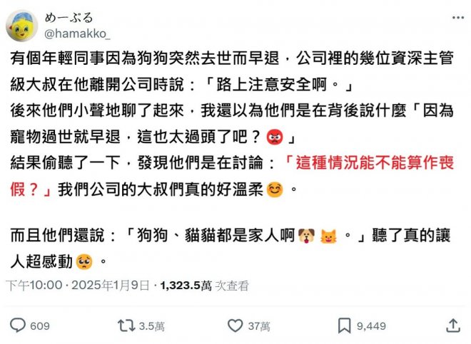 旅日作家「魚漿夫婦」在FB分享了這位網友的經歷。原PO透露,年輕同事因為愛犬過世,請假早退,而幾位資深主管得知後,叮囑他「路上注意安全」,隨後悄悄討論是否可以把這種情況算作喪假,並認為寵物就像家人一樣。這樣的體貼讓原PO心中充滿感動,「我們公司的大叔們真的好溫柔。」