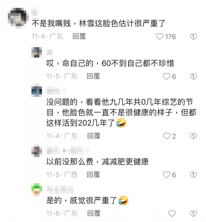 根據《Yahoo奇摩新聞》報導,香港男星林雪過去出演《食神》表現出色,曾獲第37屆金馬獎「最佳男配角」提名,人氣水漲船高,深受中、港、台三地觀眾喜愛,隨著年紀增長,他近年來體重急速上升,去年11月友人分享一起吃宵夜的影片,眼尖網友發現林雪肚腩變更大,臉色更是發黑冒黑斑,推測體內可能有毒素或炎症,嚇壞直呼:「不是我嘴賤,林雪這臉色估計很嚴重了!」