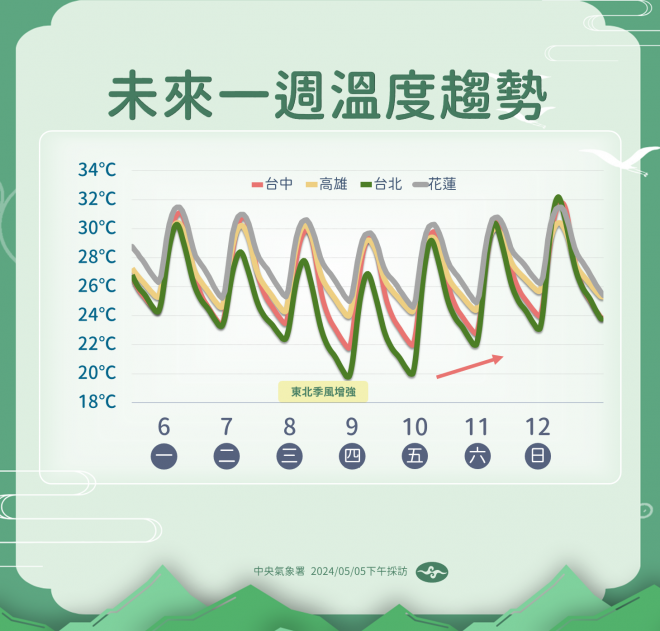 但歐宗學坦言,屆時北部有大陸冷高壓東移、南下,產生一定強度的東北季風,會讓北部氣溫下降不少,早晚溫度約落在20度,白天則為26、27度左右,中南部也會因此下降,但僅為雲量增多,且溫度下降幅度不高,仍有望緩解炎熱天氣。至於降雨,這2天處於迎風的北、東部雲量將增多,出現局部短暫雨;中南部山區則是午後局部雷陣雨,南部平地也可能有雨勢波及,需注意下午的天氣狀況。