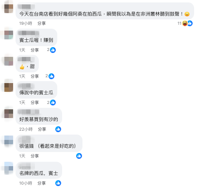 網友看到紛紛羨慕直呼:「這一定是沙甜多汁的大西瓜!」、「賺爛了賺爛了!買西瓜送賓士欸!」、「賓士瓜喔!賺到」、「傳說中的賓士瓜」、「賓士原廠大西瓜」、「什麼神仙家庭,西瓜還要吃賓士款的!」「極品」也有水果攤販坦言:「要吃到這種賓士西瓜,機率非常低,我自己也沒遇過。」